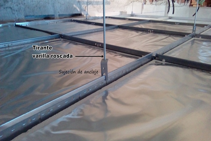 sobre una estructura de perfiles metálicos unidos entre sí mediante un sistema de click que permite ser desmontado en cualquier punto para facilitar el acceso a su